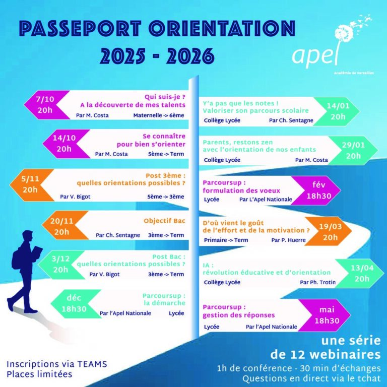 Élaboré conjointement entre les 4 départements (Yvelines, Essonne, Hauts de Seine et Val d’Oise) et l’Académie de Versailles, ce cycle offre aux parents des informations en lien avec l’orientation et tente de répondre à tous leurs questionnements.